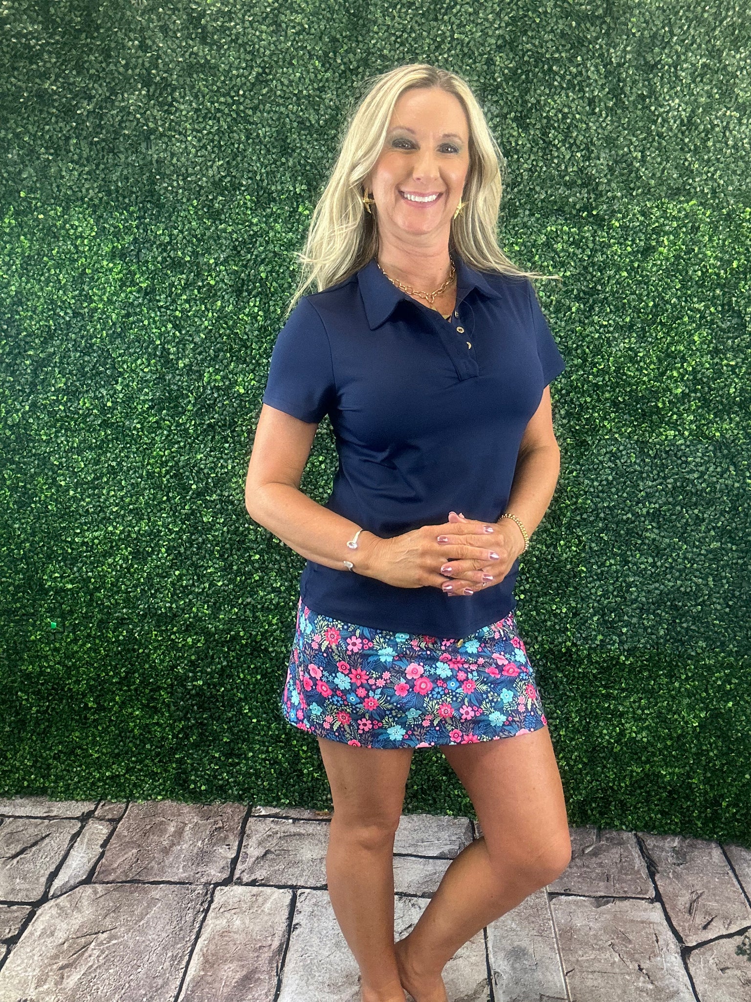 Stay polished and comfortable in our Navy Short Sleeve Polo Top! Designed with elegant gold button detailing and a feminine scallop trim along the button placket, this top brings a chic twist to a classic style. The lightweight, stretchy fabric offers UPF50+ protection, making it perfect for golf, travel, work, or everyday wear.