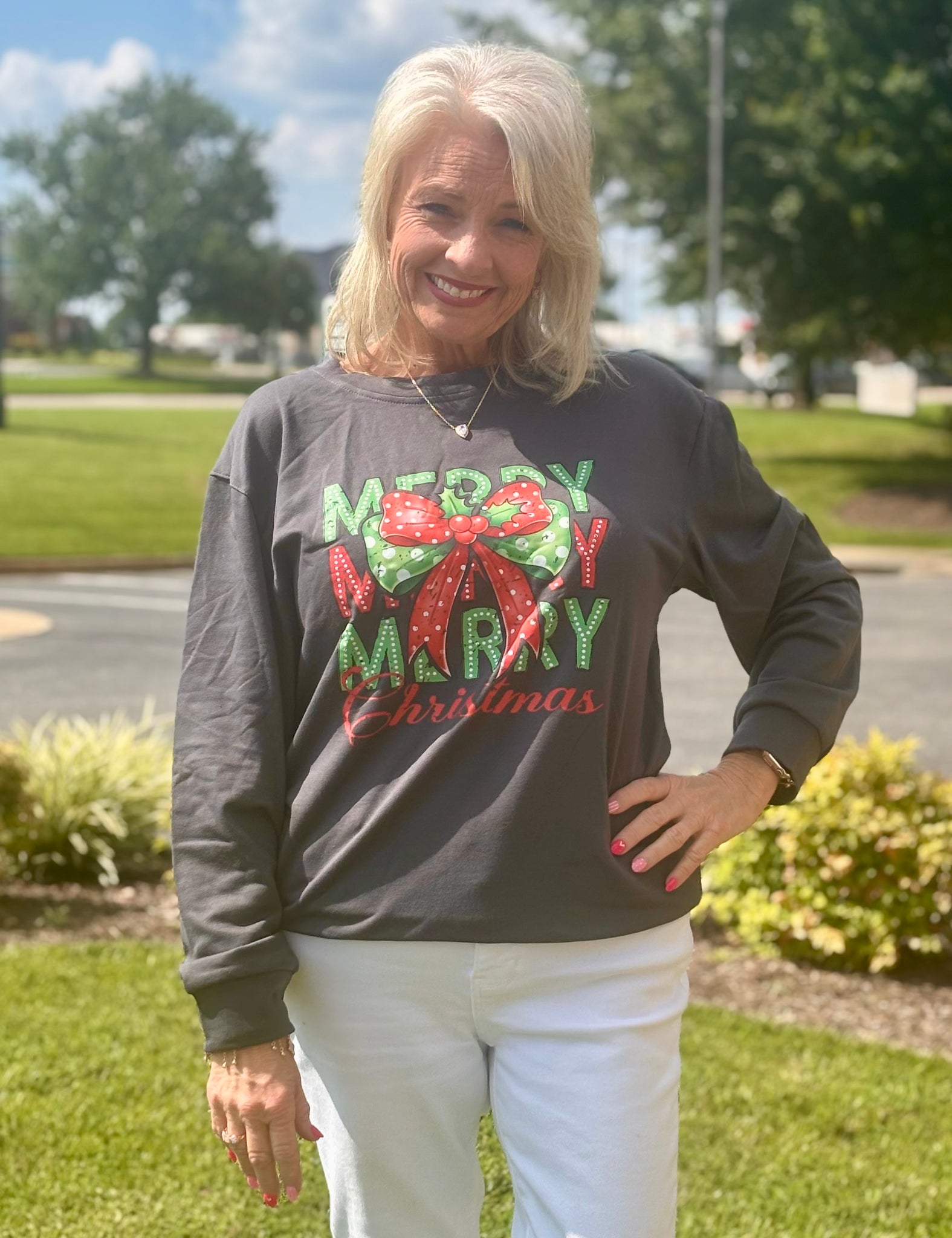 Celebrate the season in cozy style with our Merry Christmas Bow Sweatshirt! This charming holiday piece features a festive bow graphic that adds the perfect pop of cheer to your winter wardrobe. Crafted from a soft, cotton-blend fabric, it keeps you warm and comfortable on chilly days. Easy to pair with jeans, leggings, or skirts, it's a versatile favorite for holiday gatherings or casual looks. Available in sizes S–2XL for a flattering fit on everyone. Makes a heartfelt and stylish gift for the season!