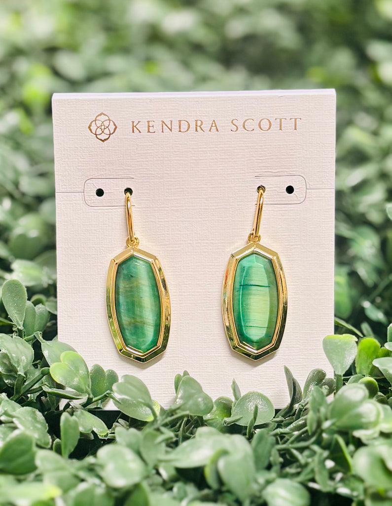 Dani Bezel Gold Drop Earrings in Green Tigers Eye