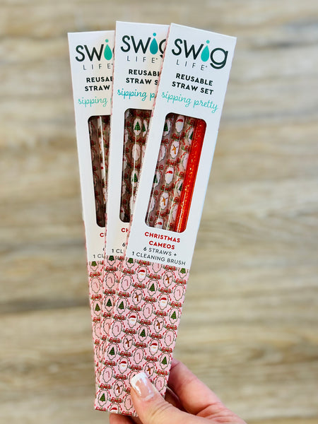 Christmas Cameos + Red Glitter Reusable Straw Set