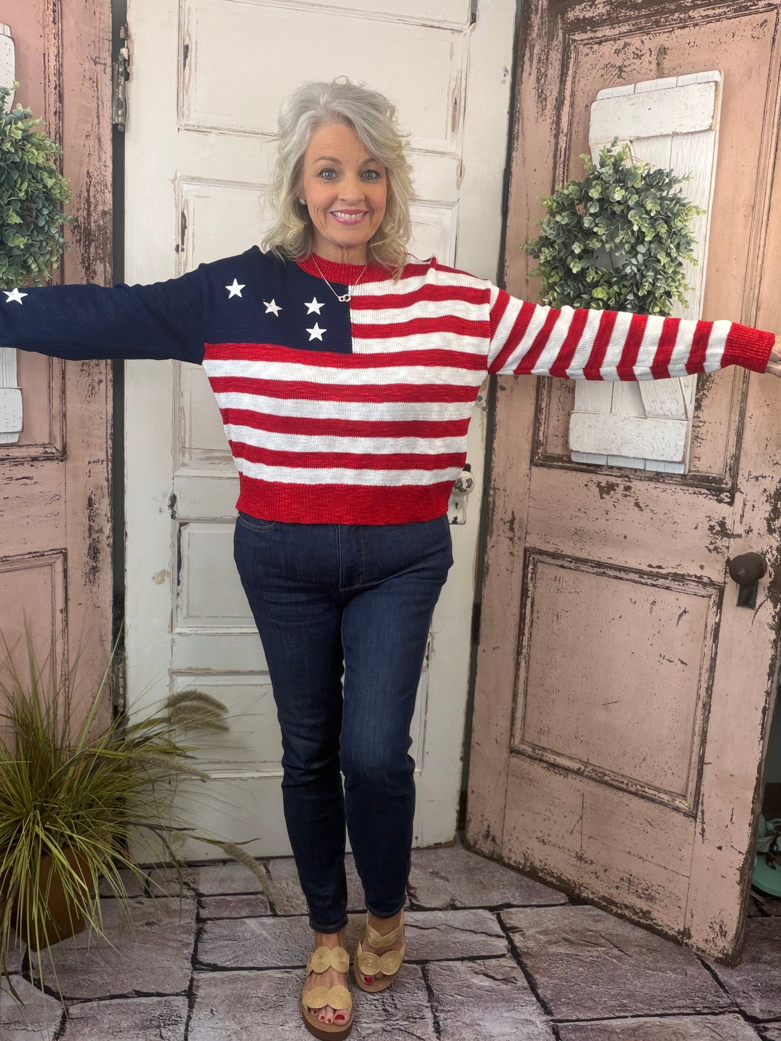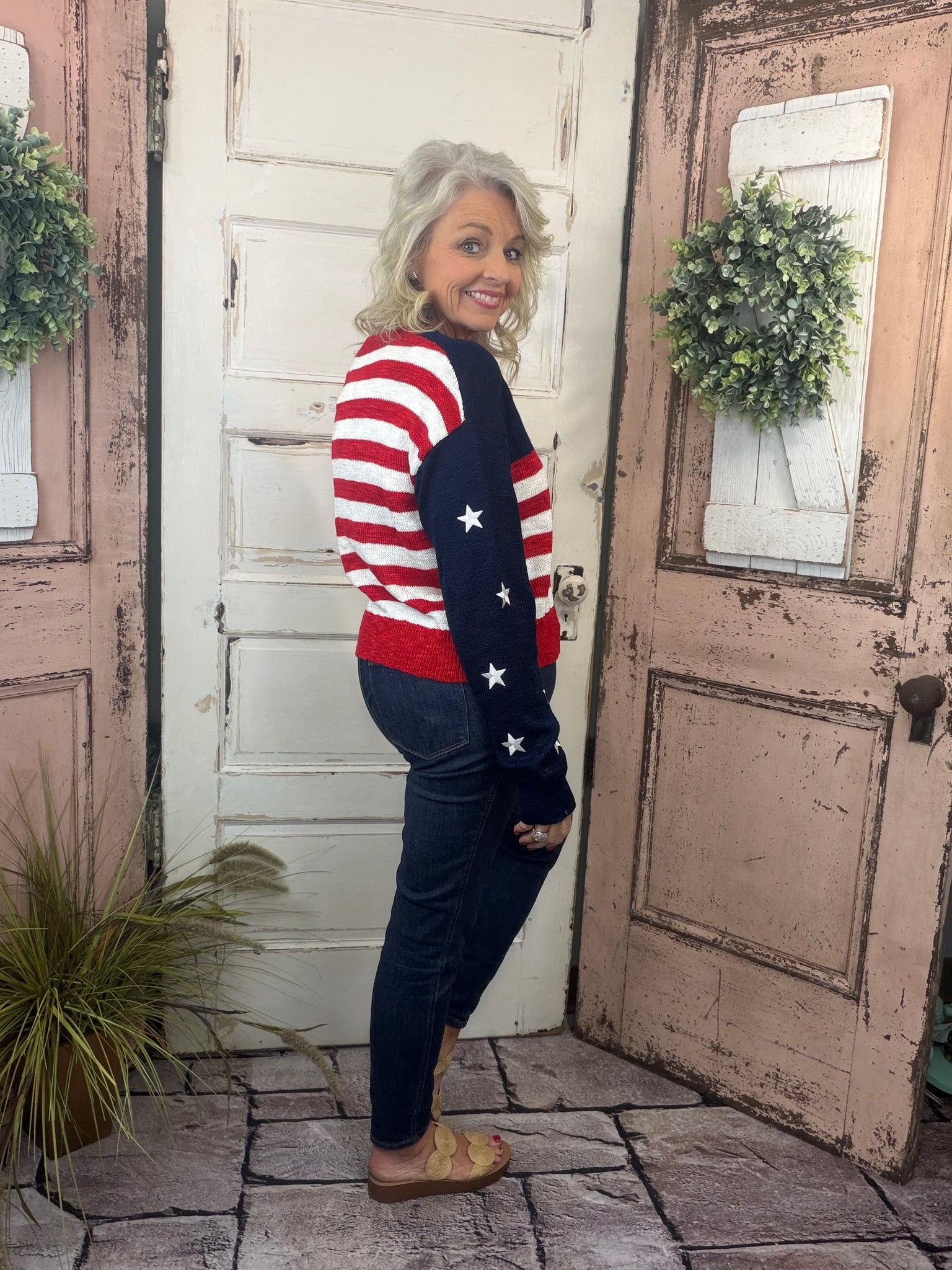 Show your patriotic style in the Simply Southern USA Sweater, a cozy statement piece made for casual days and festive occasions alike. Featuring a striped body and embroidered star details on the sleeves, this sweater adds a fun, Americana-inspired touch to your wardrobe. Designed with a relaxed fit and classic round neckline, it offers effortless comfort while still looking put together. Crafted from a soft acrylic-cotton blend, it’s perfect for layering during cooler days, summer nights, or holiday celebrations.