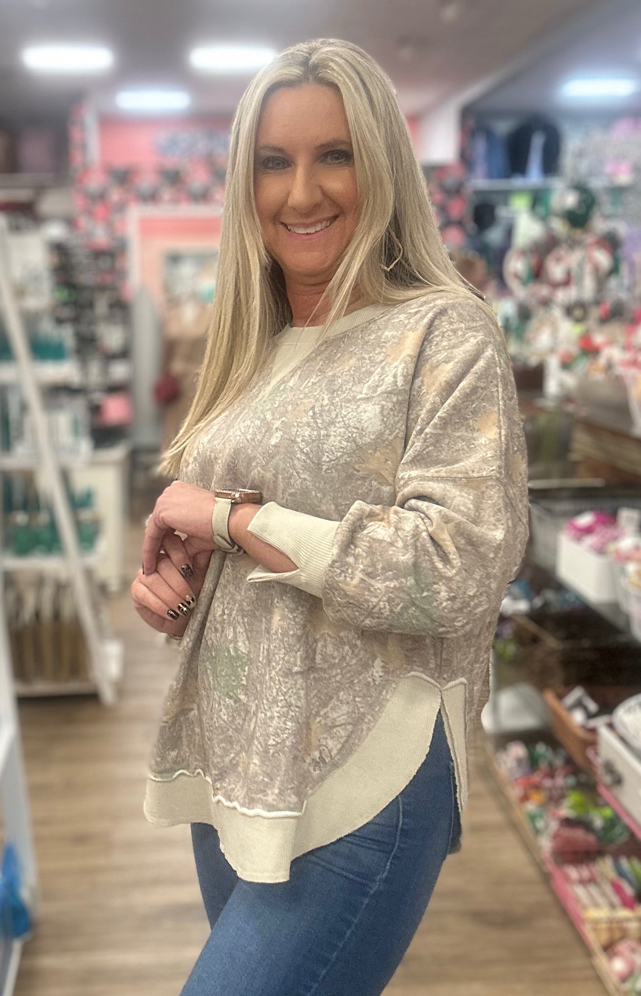 Stay cozy while keeping it cute in our Classic Camo Crew Neck Pullover. Featuring a timeless camouflage print, this must-have sweatshirt brings effortless edge to your everyday look. Designed with side slits for a relaxed fit and added movement, it’s the perfect blend of trendy street style and casual comfort.