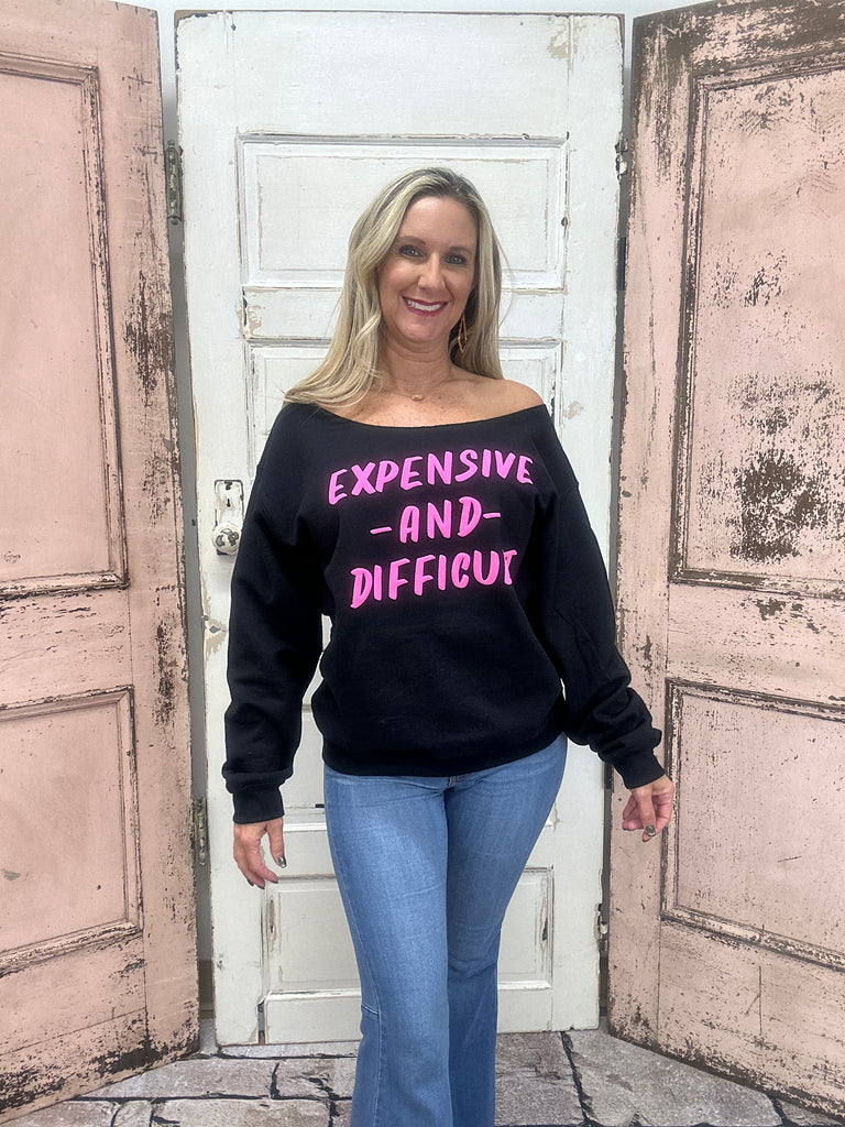 Bring sass to the season with this bold Black off-shoulder sweatshirt! Featuring a playful “Expensive & Difficult” graphic, it’s the perfect mix of festive fun and cozy comfort. The relaxed neckline lets you wear it off one shoulder for an effortless, trendy look.