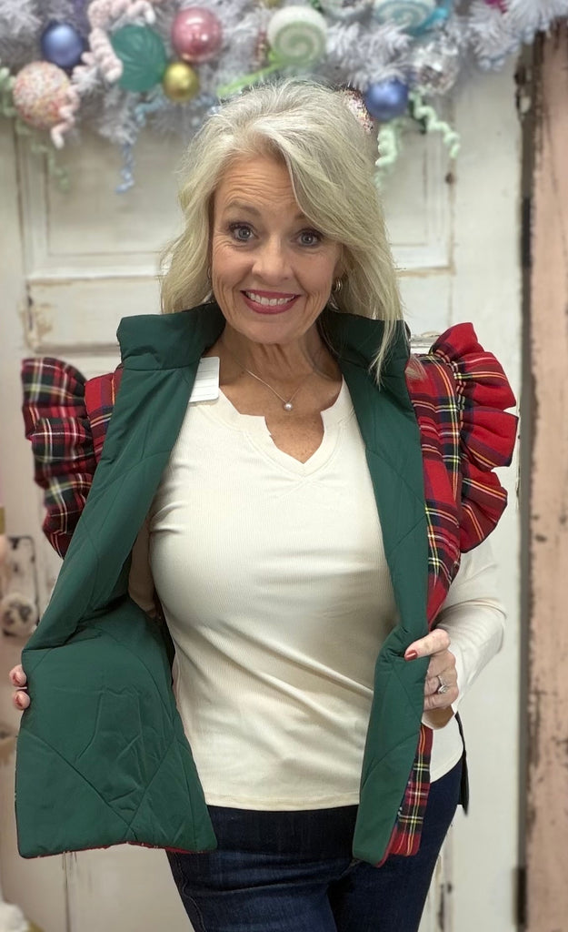 Meet your new go-to layering piece! The Jefferies Quilted Vest features a chic tartan plaid design with charming shoulder ruffles and stylish cotton twill tape side ties. Made for versatility, this vest reverses to a solid quilted nylon, giving you two looks in one. Designed in a flattering one-size-fits-most silhouette, it measures approximately 25" from shoulder to hem—perfect for adding a pop of personality to any outfit.