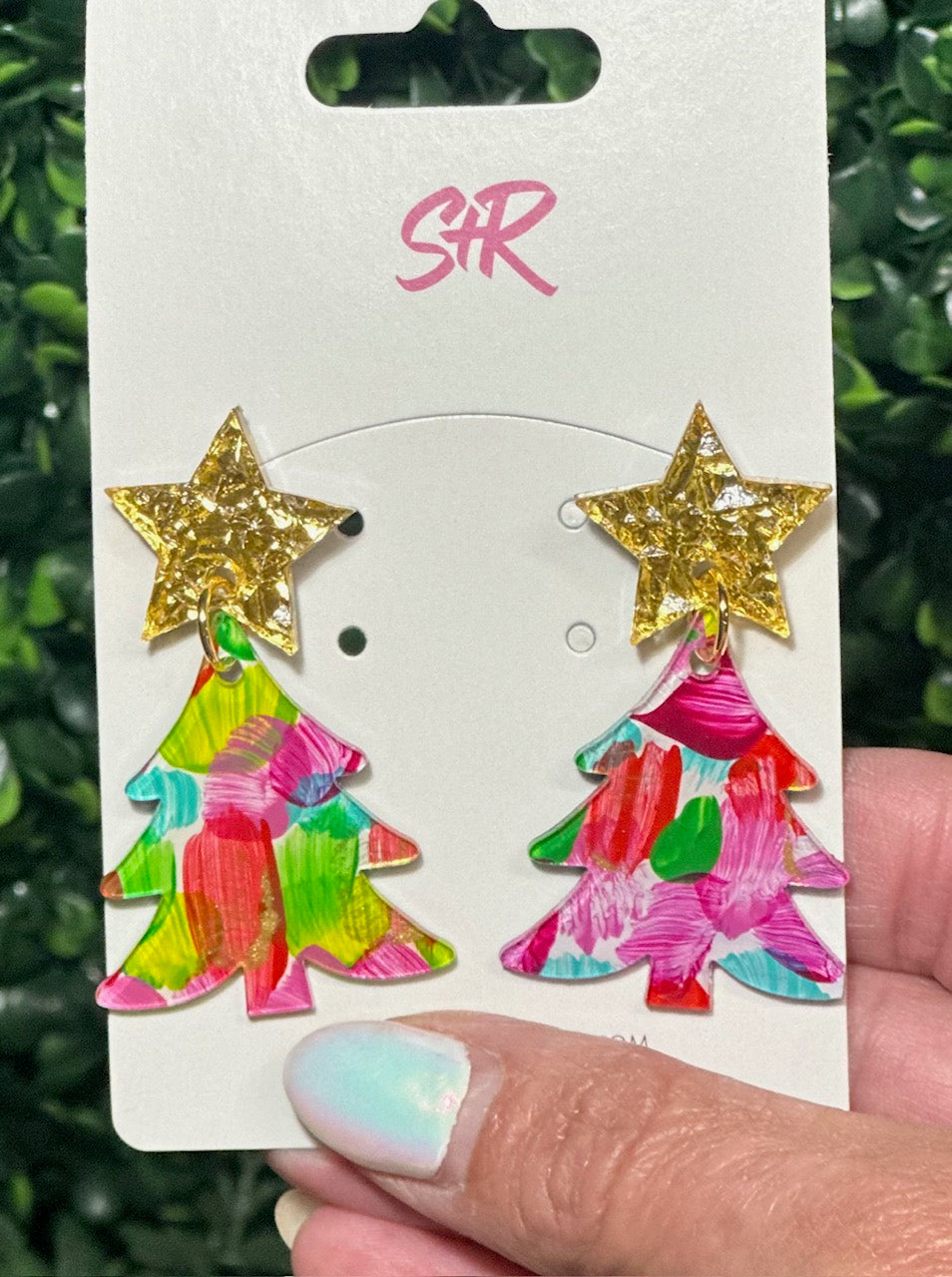 Whimsical, festive, and full of charm — our Hand-Painted Multicolor Christmas Tree Dangle Earrings are true holiday showstoppers! Topped with a shimmering gold lamé star and bursting with hand-painted color, each pair is a one-of-a-kind piece of art. No two are exactly alike, making them as unique as your holiday spirit. Lightweight, hypoallergenic, and nickel-free for all-day comfort and joy.