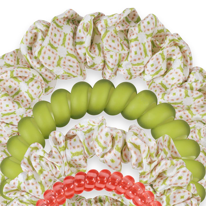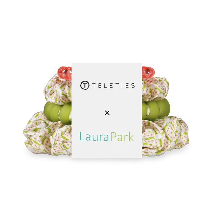 Pine & Pearl Mix Pack Hair Ties in Green, Red, and White offer a strong grip without damage, doubling as a stylish bracelet when not in use. The TELETIES x Laura Park Holiday Collaboration features bold, playful designs that combine Laura’s vibrant art with TELETIES signature function.