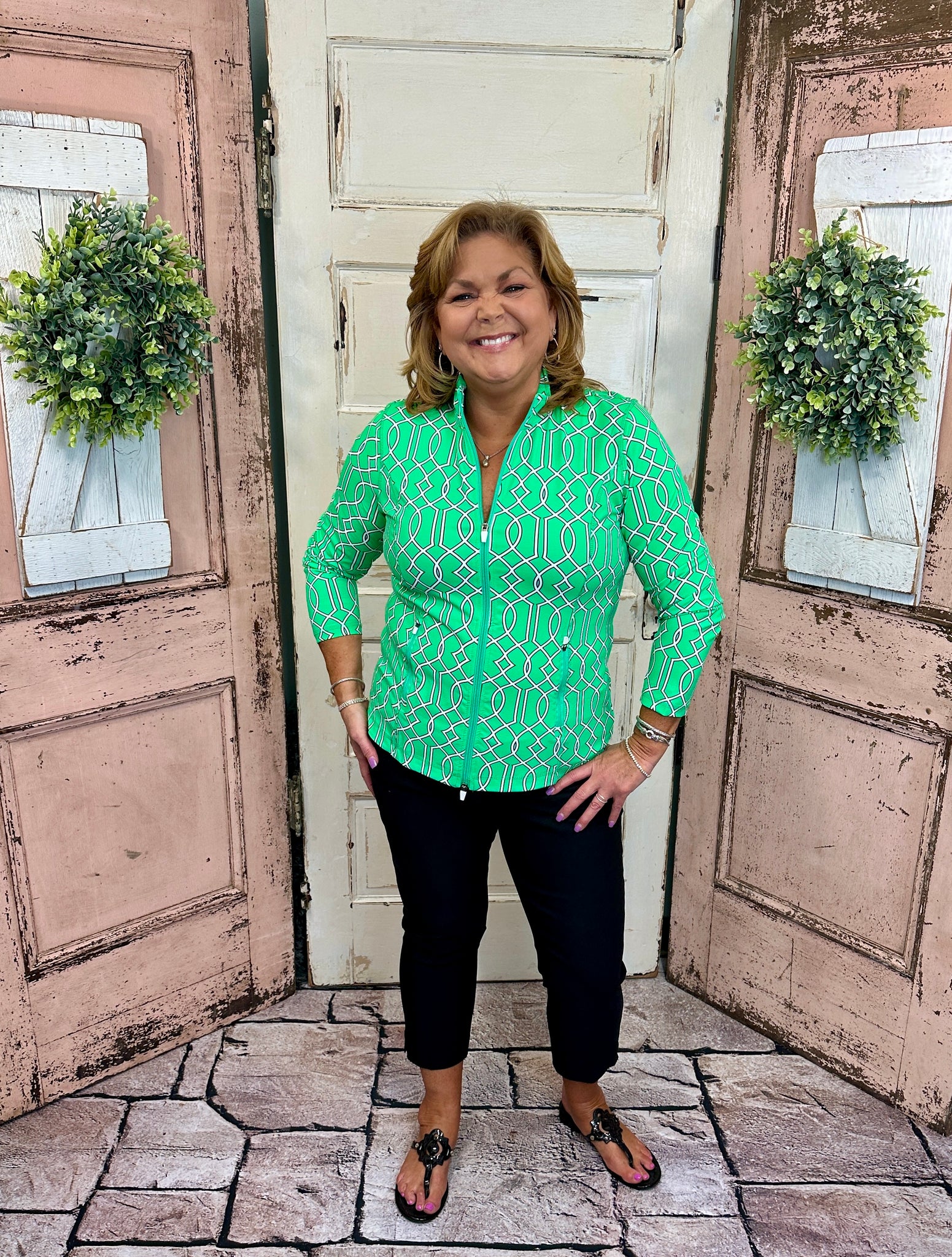 This jacket is a must-have for the fall season, designed by Lulu B to elevate your style game. With long sleeves, a full length zipper, and signature cooling fabric, it offers both comfort and function. Wear it as an athleisure piece or make a statement, either way, you'll receive endless compliments. Made of 92% Nylon and 8% Spandex, this jacket features a UPF50+ fabric, a two-way zipper, a mock neck style collar, front pockets, and contrast stitching at the seams. With a slight high-low hemline and pre-shrunk material, this jacket is the perfect addition to your wardrobe. Center back length: 25 inches.